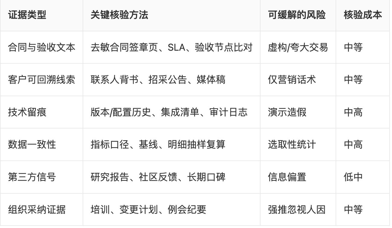 第二步:真实性核验。围绕合同文本、技术留痕、数据一致性、组织采纳证据构建核验清单,采用"至少三源"交叉验证。例如,要求演示去敏审计日志与配置历史,抽样验证 KPI 的计算口径与数据基线,并通过公开渠道匹配时间线。对"不提供任何去敏材料"的供应商,应降低真实性评分,并记录原因。若供应商可提供客户愿意接受的匿名背书,或安排短时、可控范围的客户转介交流,可显著提高真实性置信度。