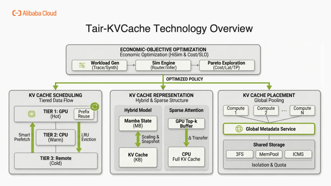 **Economic-Objective Optimization:**Tair KVCache 在整套架构之上构建了一个支持多级 KV Cache 模拟的高保真仿真引擎。该引擎持续探索多维帕累托前沿,主动平衡计算成本、存储成本、Token 延迟以及系统吞吐量,从而让我们能够实时应用经济效益最优的管理策略。