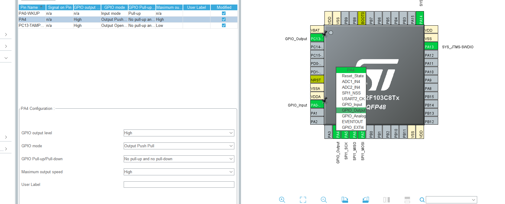 此时我们可以看到PA4要我们手动设置一下,设置为通用推挽模式