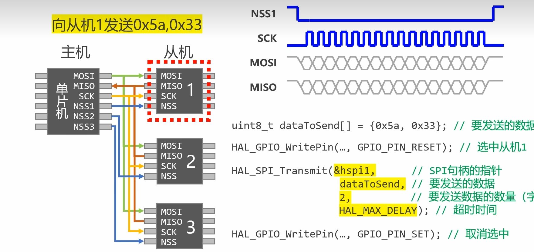 HAL_GPIO_WritePin(GPIOA, GPIO_PIN_4, GPIO_PIN_RESET); // 拉低NSS,选中从机1