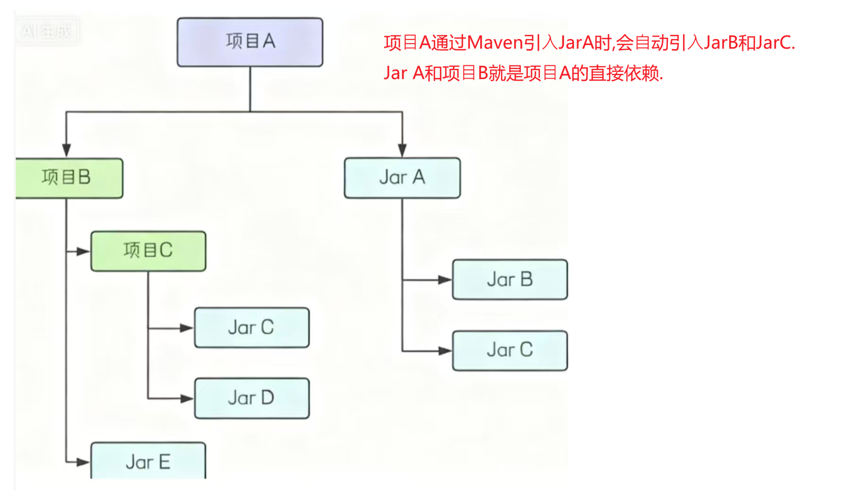 早期我们没有使⽤maven时,向项⽬中添加依赖的jar包,需要把所有的jar包都复制到项⽬⼯程下. ⽐如A依赖B,B依赖C, 那么A项⽬引⼊B的同时,也需要引⼊C,如果我们⼿动管理这个依赖,这个过程 就会⽐较⿇烦,我们需要知道每个库都依赖哪些库,以及这些依赖之间的版本是如何关联的.但使⽤maven的话,就可以避免管理所需依赖的关系。我们只需要在pom⽂件中,定义直接依赖就可以 了,由于maven的依赖具有传递性,所以会⾃动把所依赖的其他jar包也⼀起导⼊
