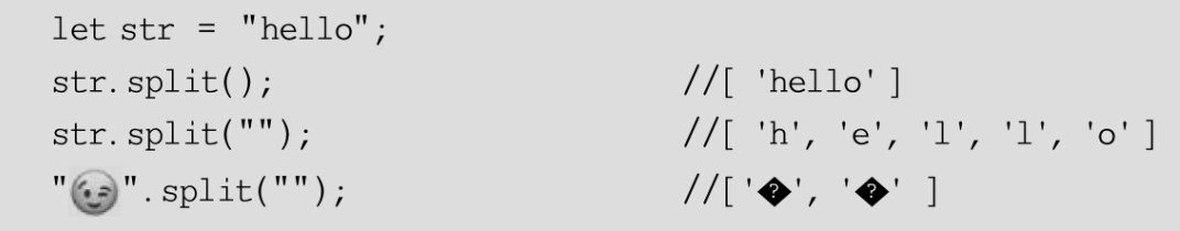 如果没有给split()传递参数,则它会返回只有1个元素的数组,这个元素是原字符串本身,而如果给split()传递了空白字符串,则会把每个字符都分割出来放到数组中,这里需要注意的是,分割结果是按16位的代码单元来展示的,如果字符使用了两个代码单元,则会分割成两个,结果数组的长度也会相应地增加,代码如下:
