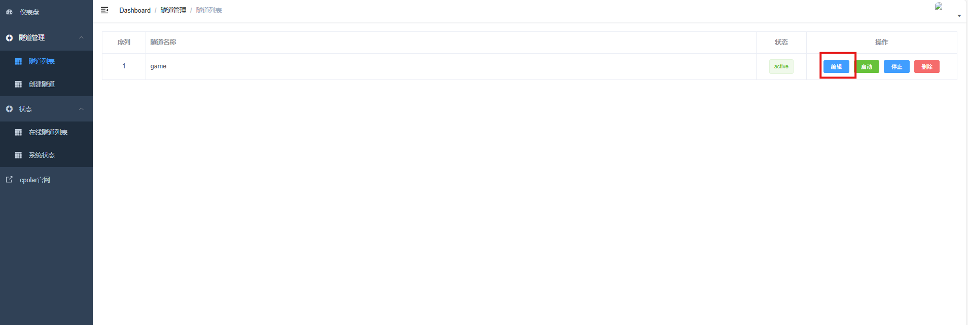 登录cpolar web UI管理界面,点击左侧仪表盘的隧道管理------隧道列表,找到所要配置的隧道musicc,点击右侧的编辑。