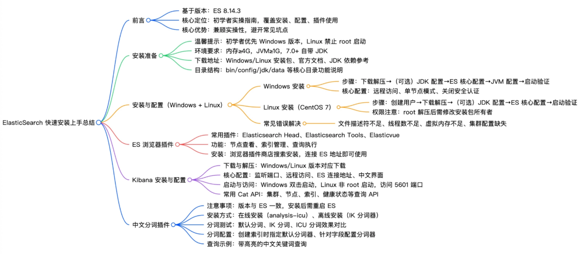 本文基于 ElasticSearch 8.14.3 ,系统梳理 Windows 与 Linux 下的安装部署、核心配置、Kibana 集成、中文分词插件(IK)安装等全流程。内容兼顾实操性 与避坑指南,助你快速搭建本地开发环境。