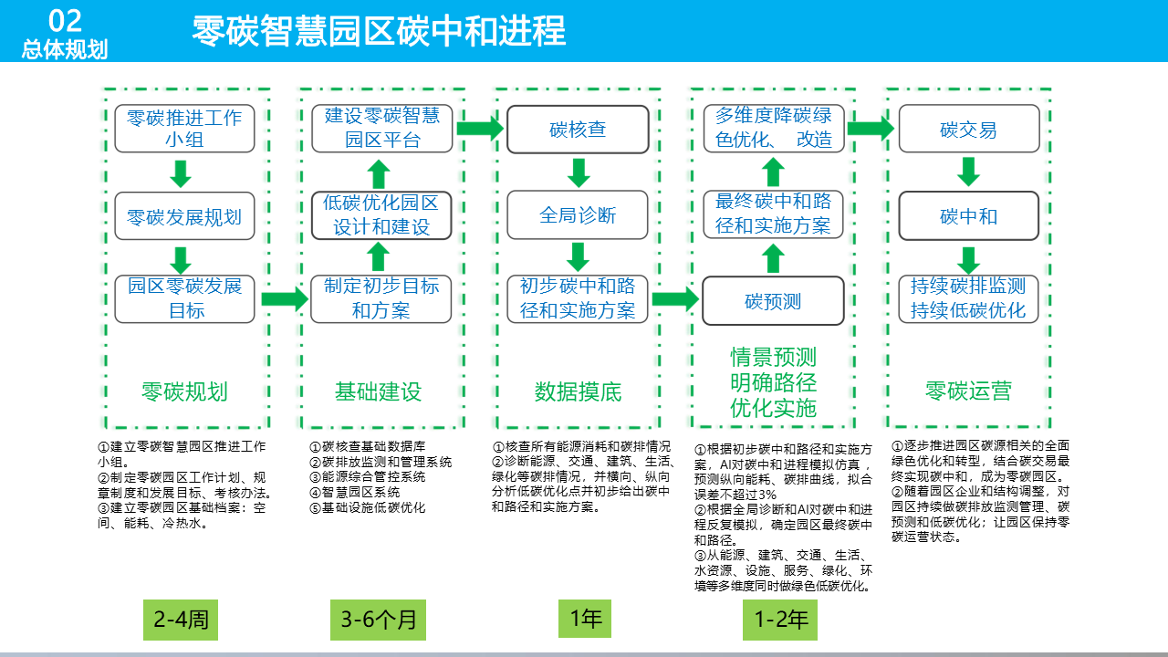 因此,将园区定为精准减排的落脚点、攻坚区,是我国实现碳达峰碳中和目标的必然要求和重要途径。文章还介绍了国家层面和北京地区在碳达峰碳中和方面的政策指导文件,以及智慧园区IOC总览解决方案、产业分析解决方案和零碳专题解决方案等内容。这些解决方案旨在通过多维度降碳、绿色优化和改造等措施,最终实现园区的碳中和目标。