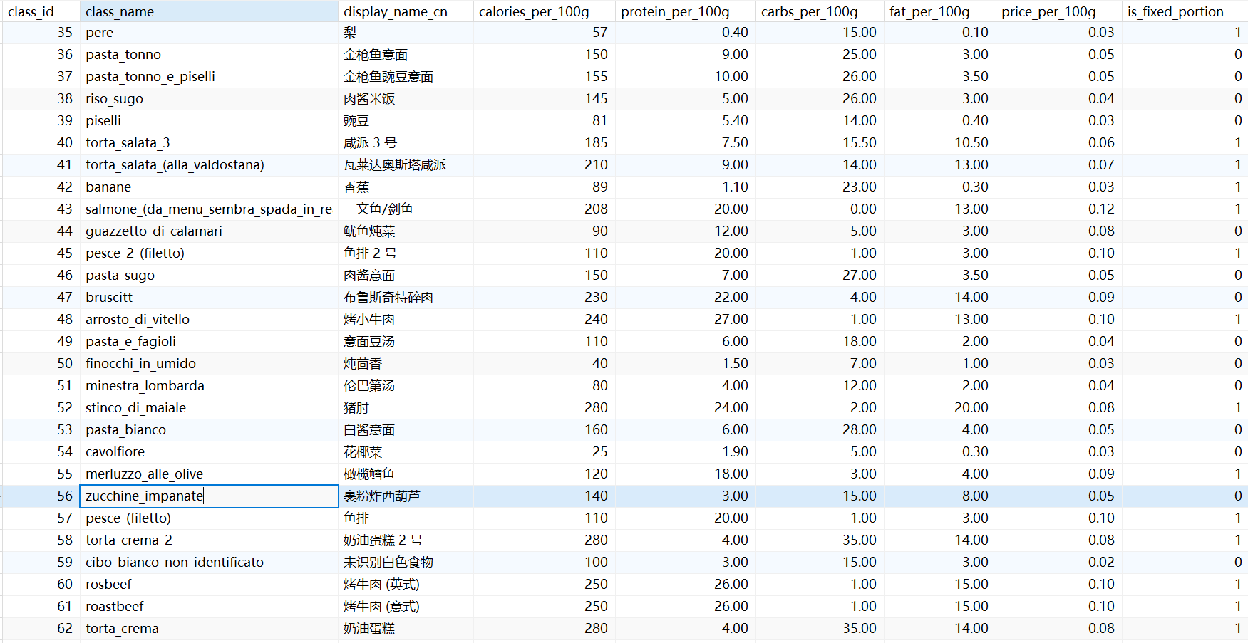数据库设计是本系统的关键创新点。每张数据记录包含class_id作为主键,关联calories_per_100g(每100g热量)等核心指标。特别设计了is_fixed_portion布尔标志位,用于区分售卖模式: