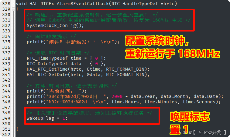 cppvoid HAL_RTCEx_AlarmBEventCallback(RTC_HandleTypeDef *hrtc) { /* 唤醒后:重新配置系统时钟,这一步至关重要! */ // 调用 CubeMX 生成的系统时钟配置函数,恢复为 168MHz 主频 */ SystemClock_Config(); // 配置系统时钟,重新运行于168MHz /* 闹钟触发提示 */ printf("闹钟B 中断触发!! \r\n"); // 打印提示 /* 读取 RTC 时间日期 */ RTC_TimeTypeDef time = { 0 }; // 时间 时-分-秒 RTC_DateTypeDef data = { 0 }; // 日期 年-月-日 HAL_RTC_GetTime(hrtc, &time, RTC_FORMAT_BIN); // 读取时间数据; 必须先读时间后读日期; 写操作时,也必须先写时间后写日期,否则数据可能错乱 HAL_RTC_GetDate(hrtc, &data, RTC_FORMAT_BIN); // 读取日期数据; 必须先读时间后读日期; 写操作时,也必须先写时间后写日期,否则数据可能错乱 /* 打印 时间日期,便于观察调试 */ printf("当前时间: "); printf("%04d年%02d月%02d日 ", 2000 + data.Year, data.Month, data.Date); // 打印 日期 printf("%02d:%02d:%02d \r\n", time.Hours, time.Minutes, time.Seconds); // 打印 时间 /* 【关键】设置唤醒标志,通知主循环执行任务 */ wakeUpFlag = 1; // 设置唤醒标志,通知主循环执行任务 }