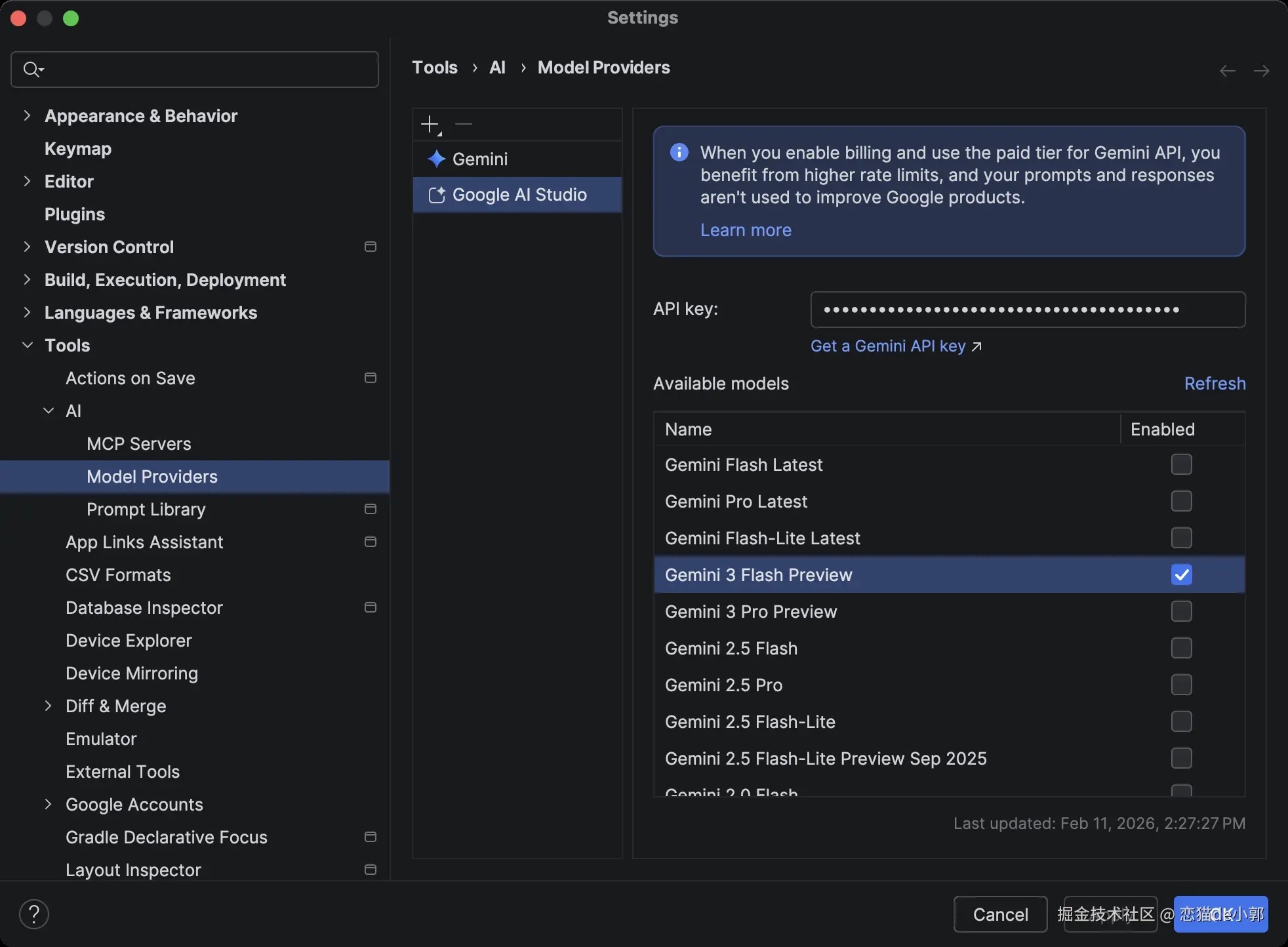 不过,虽然 Android Studio 的默认自带的 Gemini 模型是 Free ,但是属于相对弱智的老模型,所以如果想要体验满血版本的,就需要使用自己的 Google AI Studio API 的 Key 解锁,可以在 Settings > Tools > AI > Model Providers 进行设置: