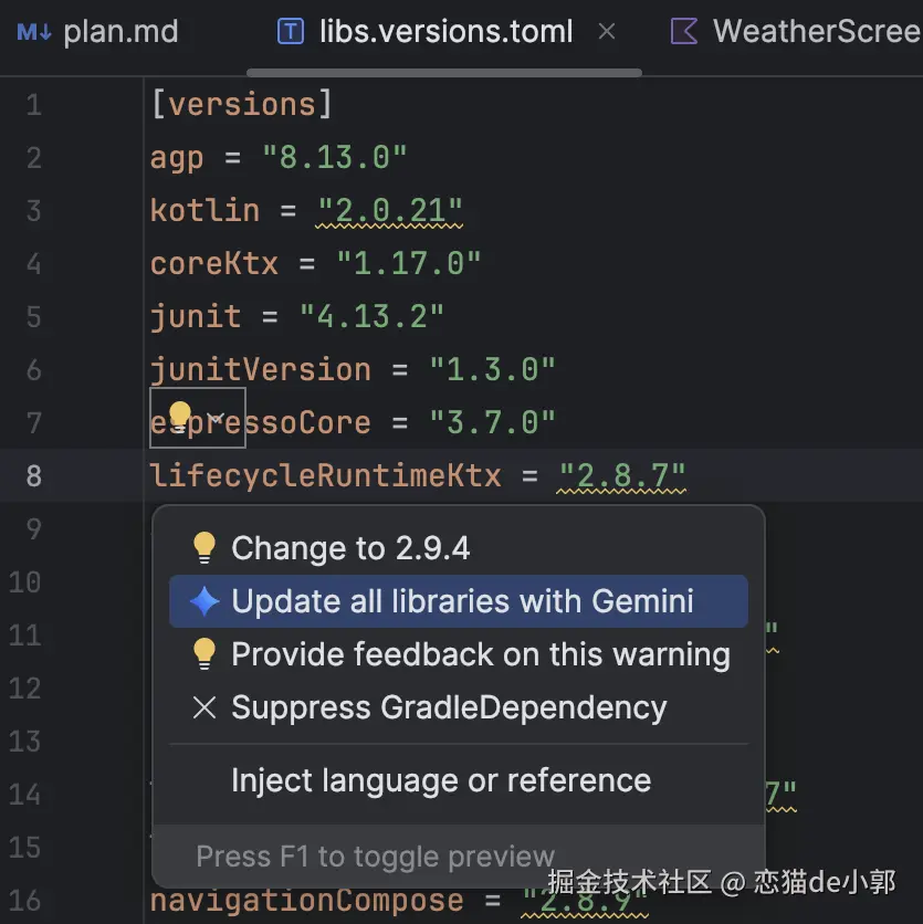 libs.versions.toml文件中,将鼠标悬停在带有下划线的版本上,然后点击 Show Context Actions > Update all libraries with Gemini