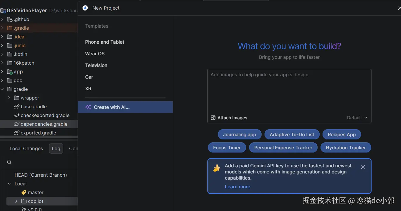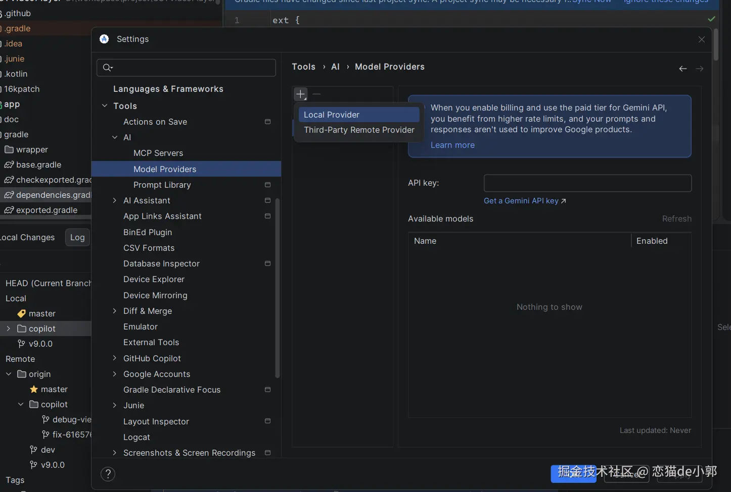 另外,你还可以配置了非 Gemini 的 Key(如 OpenAI 或本地 Llama),不过并不能作用于 Android Studio 中深度集成的 Gemini 特定流程,第三方 Provider 可以用于 Android Studio 的一部分 AI 功能,但像 Gemini Create、Update dependencies 这类明确依赖 Gemini agent 的专用流程,暂时还不支持: