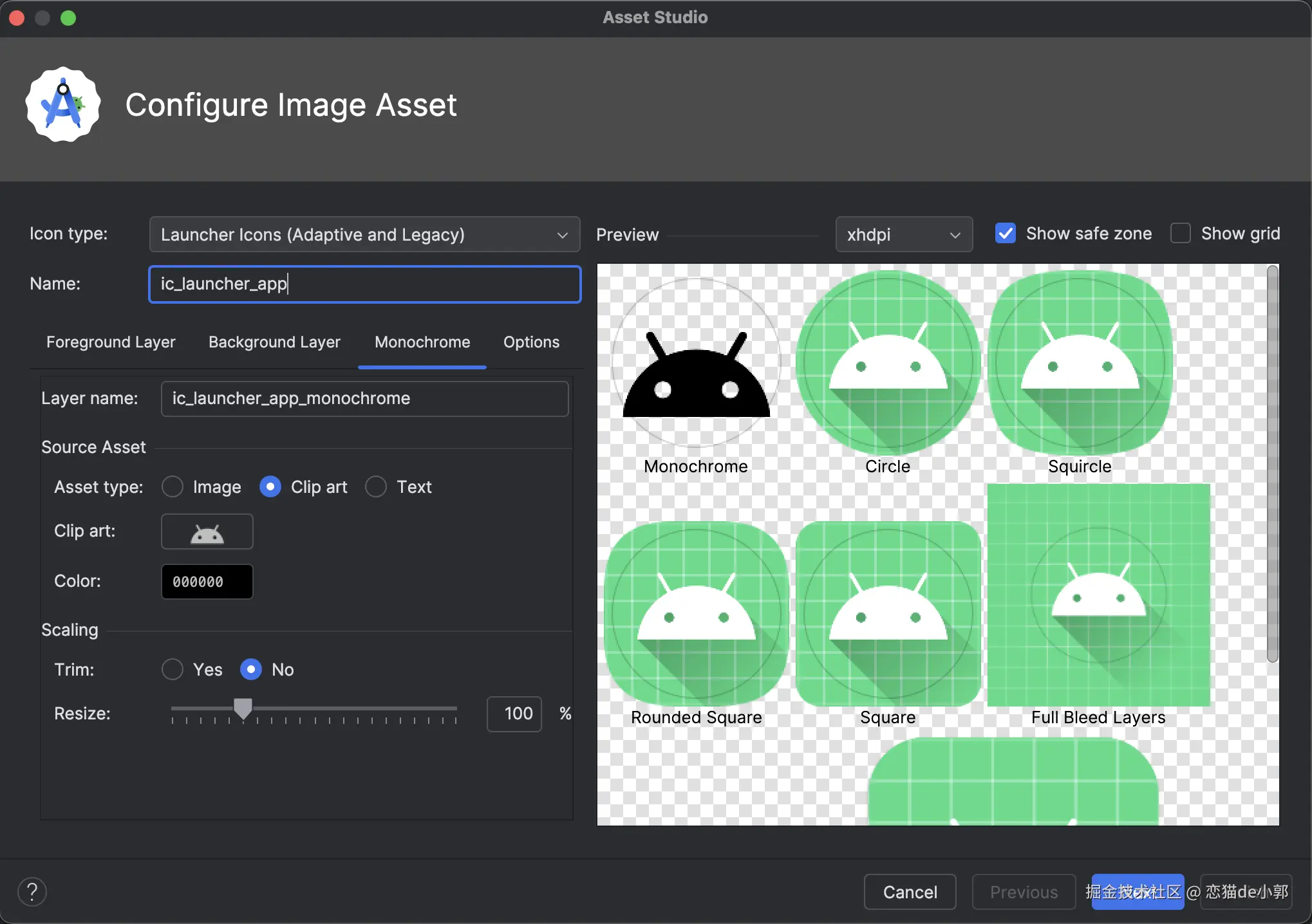 在 Android 13 +场景,用户可以选择主题化应用图标,而为了简化了主题化应用图支持,Android Studio 将新的单色图标选项直接集成到 Image Asset Studio wizard 。