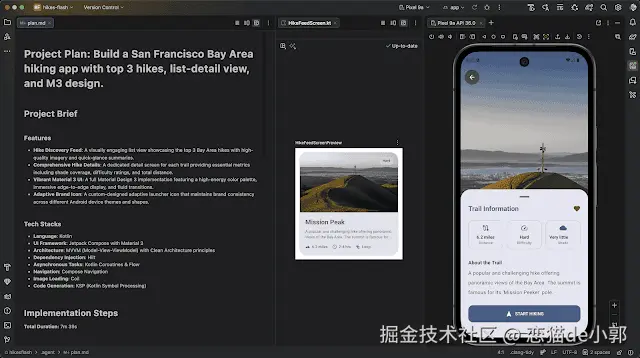 之后,AI 就会通过 plan 在完成你的项目创建,同时在 Android 模拟器或真机运行和调试项目效果,当然在这个过程里,你最好可以提供设计稿,那么效果将会更好: