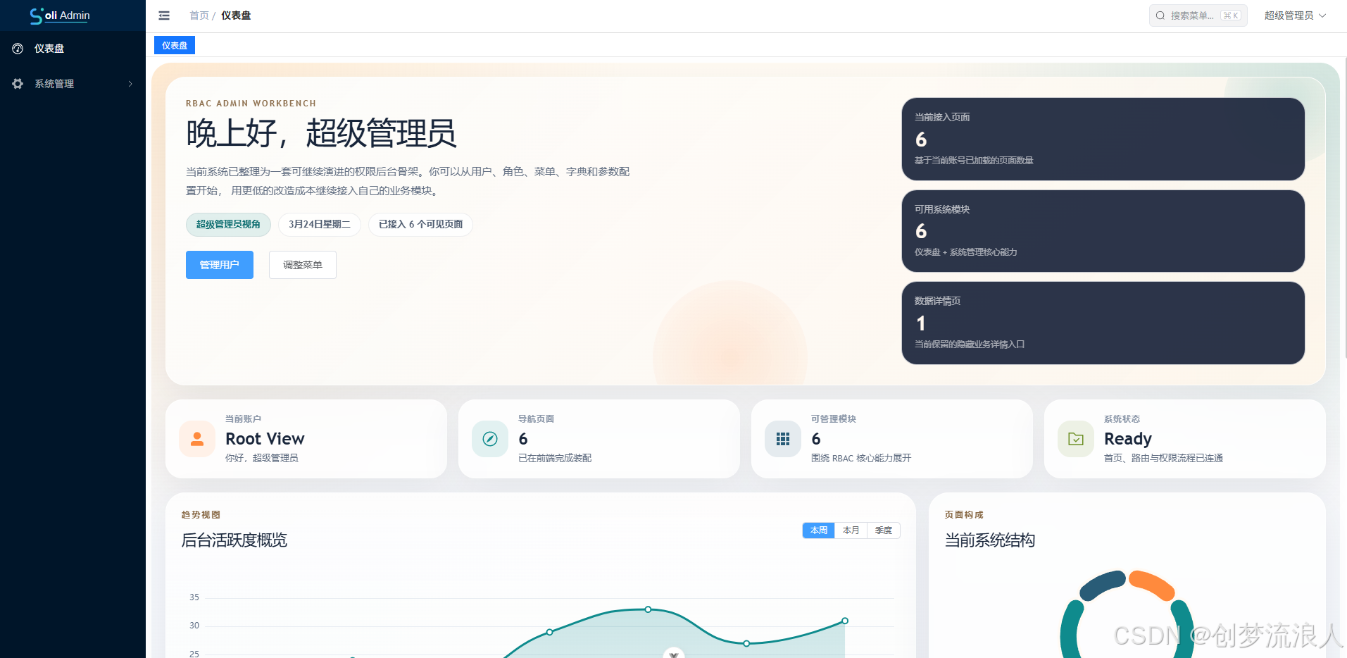 这个项目不是那种只适合演示、改起来却很痛苦的后台模板。它更像一套已经把权限后台核心链路打通、适合继续接业务模块的基础工程。