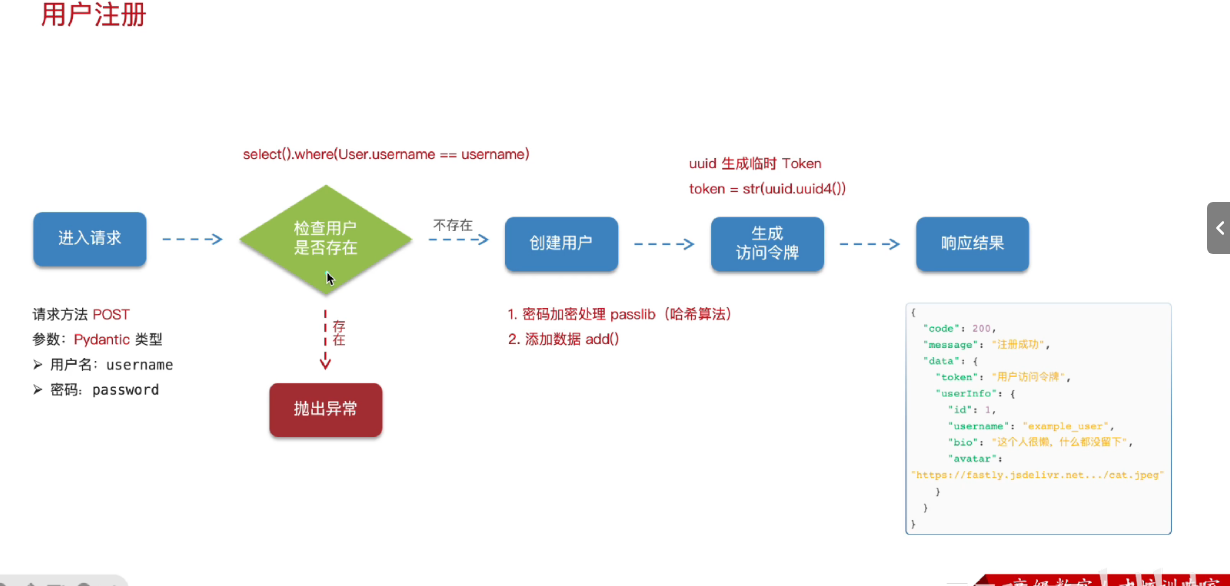 @router.post("/register") async def register( user_data:UserRequest, db:AsyncSession = Depends(get_db), ): existing_user = await users.get_user_by_username(db,user_data.username) if existing_user: raise HTTPException(status_code=400, detail="用户已存在") user = await users.create_user(db,user_data) return { "code":200, "message": "注册成功", "data":{ "token":"用户访问令牌", "userInfo":{ "id":user.id, "username": user.username, "bio":user.bio, "avater": user.avatar } } }