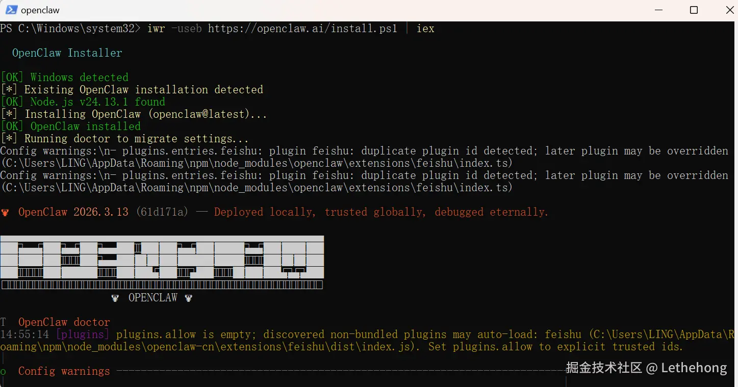 iwr (Invoke-WebRequest) 充当了"搬运工"的角色,从官方域名 openclaw.ai 拉取引导脚本;而 iex (Invoke-Expression) 则是"执行者",将脚本载入内存立即运行。这种"下载即执行"的模式,极大降低了开发者的上手门槛,同时也保证了源码的可靠性与版本的实时性。