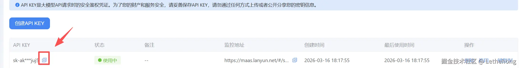 创建好以后,点击【复制】按钮,将密钥复制下来备用: