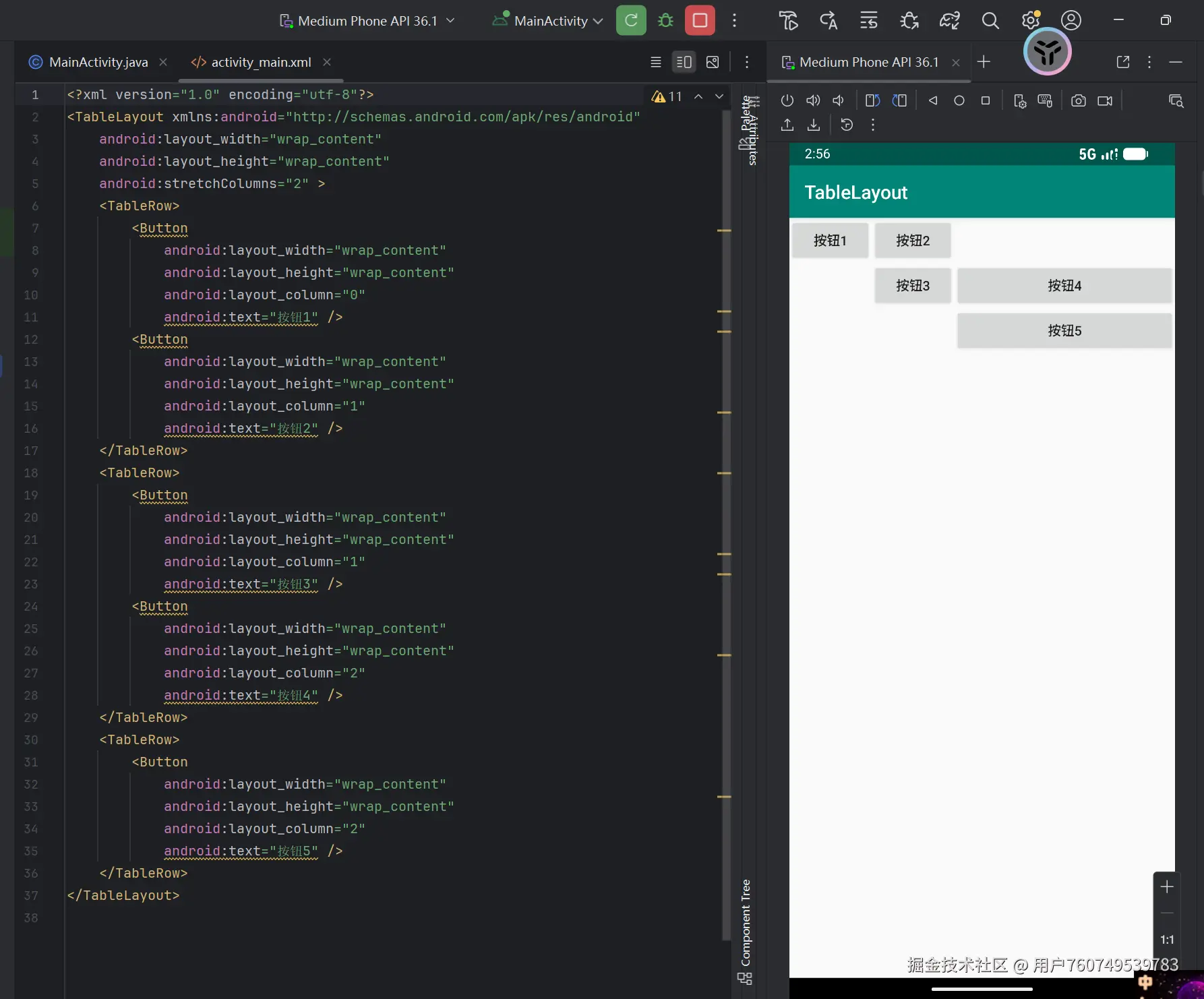 TableLayout以表格形式组织子视图,继承自LinearLayout。每行由TableRow定义,列宽由最宽单元格决定。支持android:layout_span实现单元格合并。