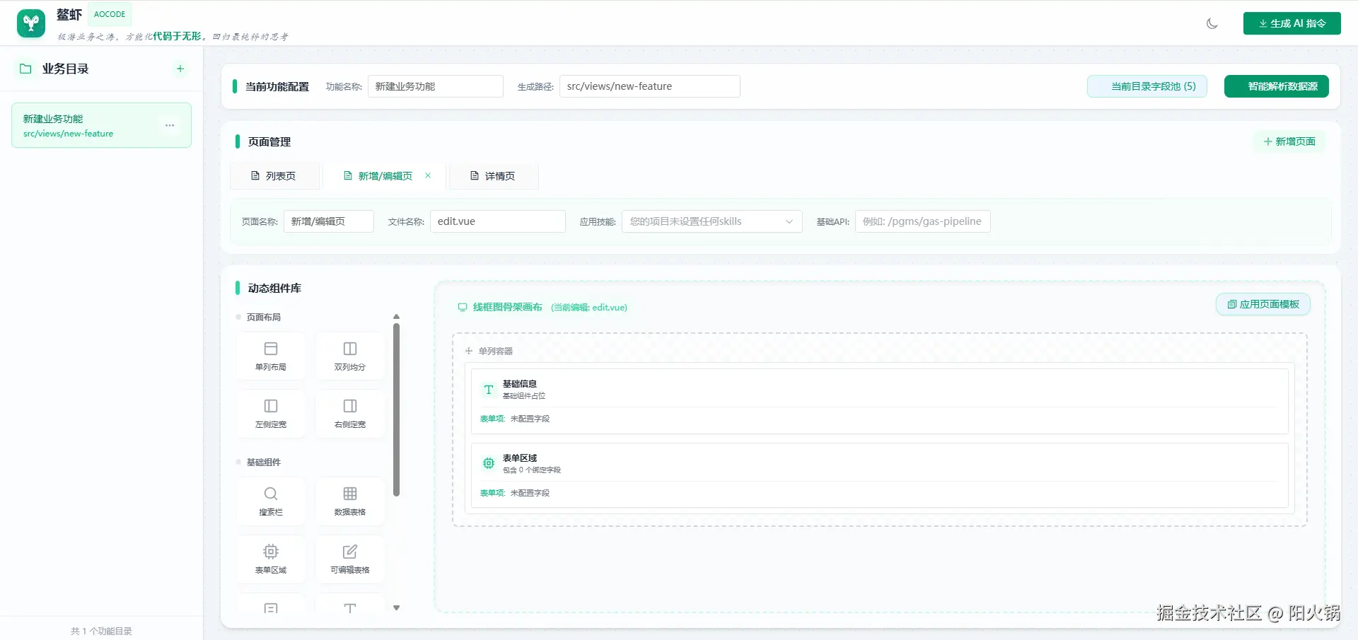 鳌虾提供了一个直观的可视化页面设计器。左侧是丰富的组件库,右侧是线框图骨架画布。开发者只需从左侧拖拽组件到画布中,即可快速搭建页面结构。