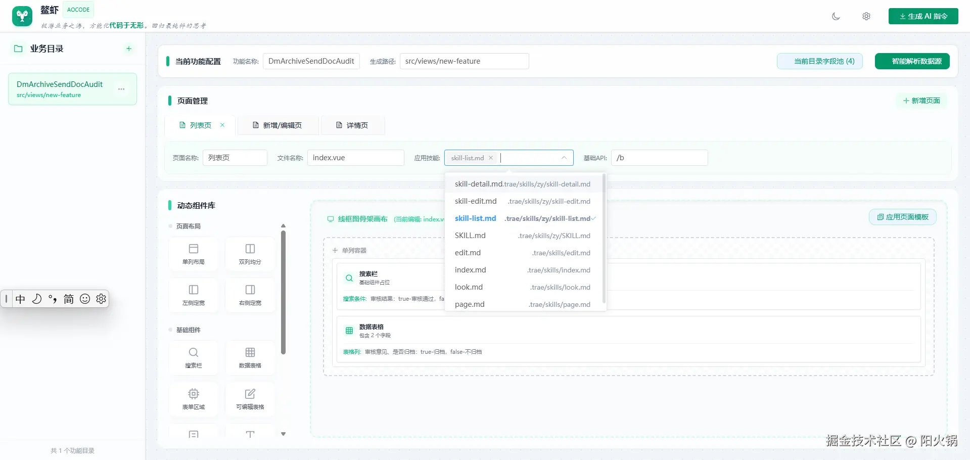 鳌虾(AoCode) 正是为解决这些痛点而生。它通过可视化拖拽的方式,让开发者无需手敲冗长的 Prompt,即可自动生成高质量的 AI 编程指令。更重要的是,它能与项目中的技能文件(skills)无缝结合,让 AI 始终在统一的规范下生成代码,从根本上减少"幻觉"的产生。