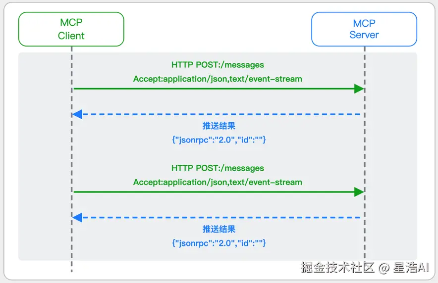 - ✅ 必要时 Client 也可以在单次请求中获得 SSE 方式响应(如需要进度通知的长时间运行任务,可以借助 SSE 不断推送进度)