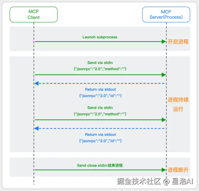 MCP Client 启动一个子进程(MCP Server)并通过 stdin 和 stdout 交换 JSON-RPC 消息来实现通信。
