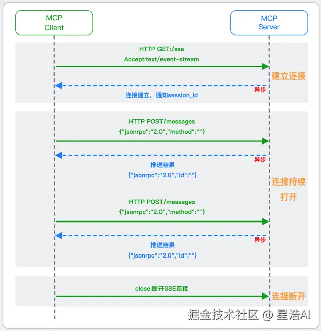 💡 简单总结:通过 HTTP Post 发送请求,但通过 SSE 的长连接异步获得 Server 的响应结果。