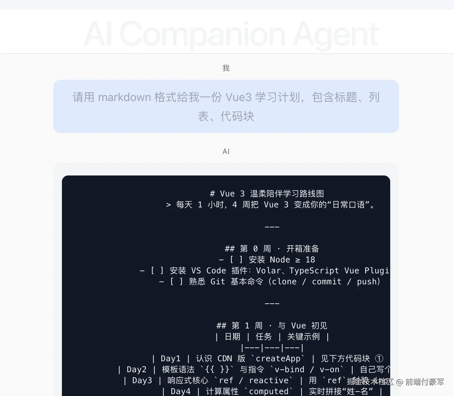 请用 markdown 格式给我一份 Vue3 学习计划,包含标题、列表、代码块