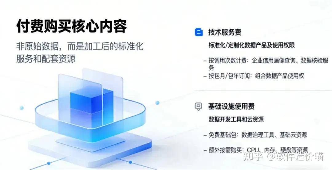一是技术服务费:对应标准化或定制化的数据产品及使用权限。比如按调用次数计费的企业信用画像查询、数据核验服务,或按包月/包年订阅的组合数据产品使用权。
