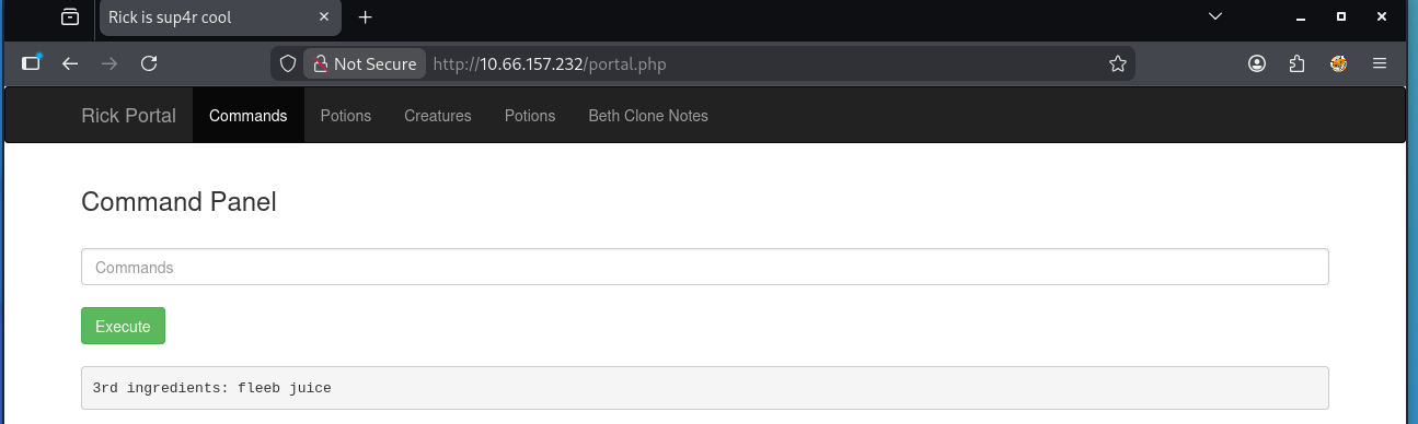 登录http://10.64.147.103/login.php,输入用户为R1ckRul3s、密码为Wubbalubbadubdub,发现直接进入了网站的命令行执行面板(Command Panel)!