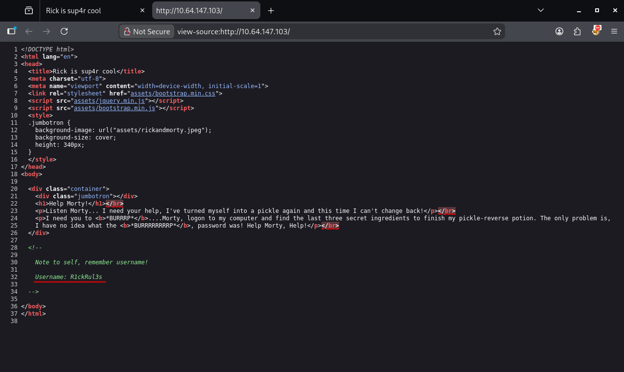 http://10.64.147.103/后进入了如下图1的网页界面,右键查看网页源码得到如下图2所示的界面,在其中看到一个用户名R1ckRul3s - Step3。查看robots.txt。访问http://10.64.147.103/rotbots.txt,进入下图3所示的画面,得到一串字符**Wubbalubbadubdub** ,推测可能是用户密码。