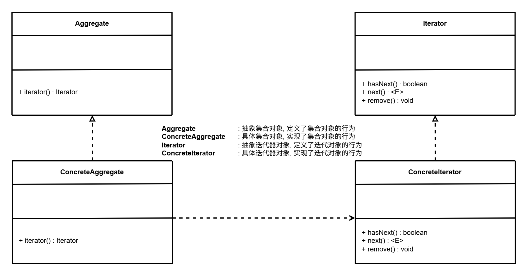 **定义:**在软件系统中, 容器通常有两个职责: 数据的存储和遍历. 从依赖性上看, 存储数据是聚合对象的基本职责而数据遍历则是可分离的. 迭代器模式将对象的遍历行为从容器中提取出来封装到迭代器对象中, 从而使聚合对象更加简单也更加符合单一职责原则.