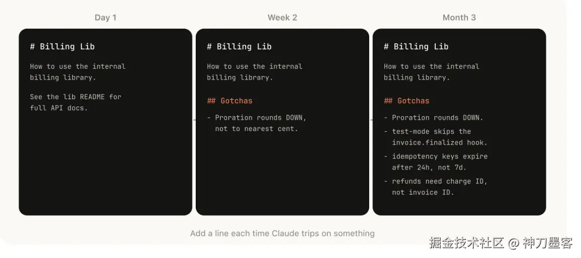 在SKILL.md里专门设一个 ## Gotchas 章节,记录 Claude 在使用这个 Skill 时反复踩的坑。每次 Claude 犯了一个新错误,就把这条加进去。这个机制的本质是把人的观察变成 Skill 的一部分------它随时间越来越准确,而不是停在你第一次写的状态。