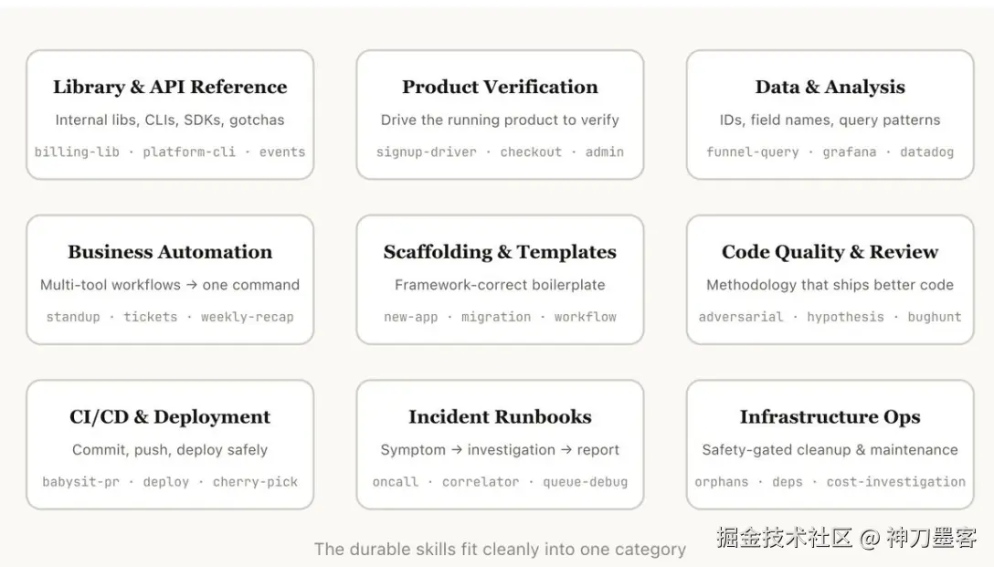 Thariq 把 Anthropic 内部的 Skills 整理成了九个类别。他说,好的 Skills 往往清晰地属于其中一类;让人困惑的 Skills 通常同时跨了好几类。这个框架本身就是一个很好的自查工具。