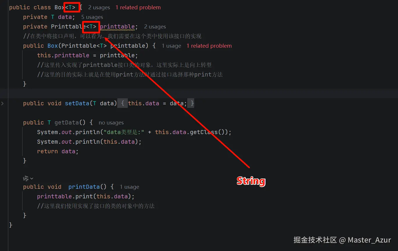 javapublic class Box<T>{ private T data; private Printtable<T> printtable; //在类中将接口声明,可以看为,我们需要在这个类中使用该接口的实现 public Box(Printtable<T> printtable) { this.printtable = printtable; //这里传入实现了printtable接口类的对象,这里实际上是向上转型 //这里的目的实际上就是在使用print方法时通过接口选择那种print方法 } public void setData(T data) { this.data = data; } public T getData() { System.out.println("data类型是:" + this.data.getClass()); System.out.println(this.data); return data; } public void printData() { printtable.print(this.data); //这里我们使用实现了接口的类的对象中的方法 } } - 为了使用接口,可以先创建一个接口的引用