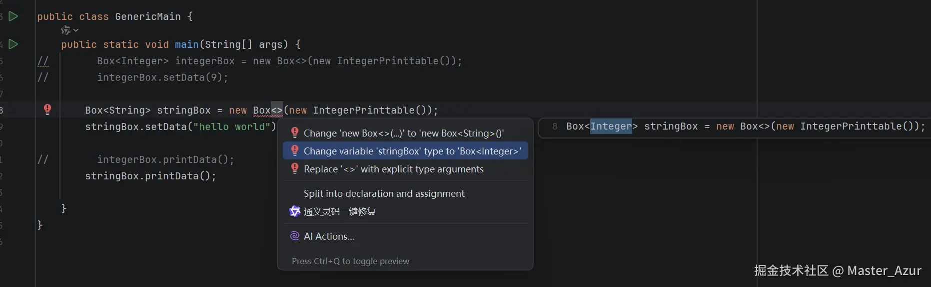 - 我们在GenericMain类中使用Box类,我们先指定Box的类型,在创建Box的对象,如下方代码所示: