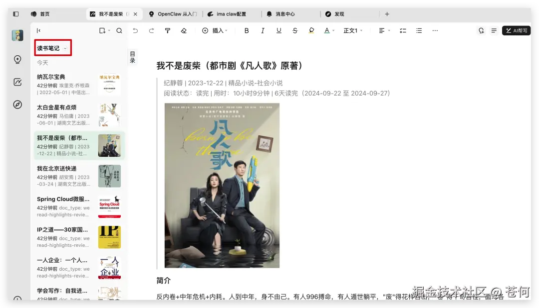 你就可以看到,本地 ob 中的微信读书笔记,全部一丝不同的同步到了 ima 笔记中。