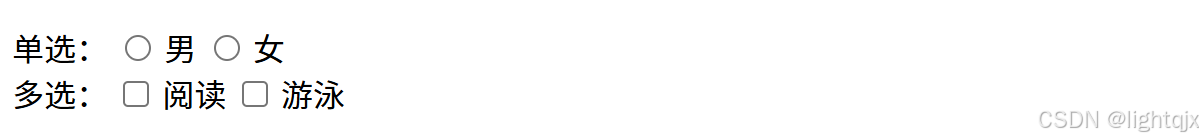 html<!DOCTYPE html> <html lang="en"> <head> <meta charset="UTF-8"> <meta name="viewport" content="width=device-width, initial-scale=1.0"> <title>Document</title> </head> <body> <form > <!-- 单选按钮 (name相同则互斥) --> 单选: <input type="radio" name="gender" value="male"> 男 <input type="radio" name="gender" value="female"> 女 <br> <!-- 复选框 --> 多选: <input type="checkbox" name="hobby" value="Reading"> 阅读 <input type="checkbox" name="hobby" value="Swimming"> 游泳 </form> </body> </html>结果展示: