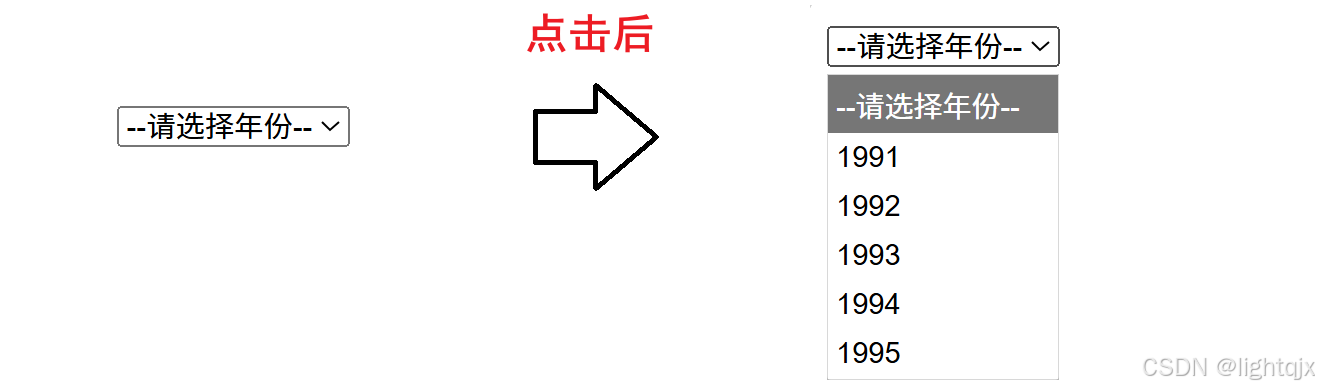 注意:在下拉列表框中的第一个选项就是我们的默认选项,具体可以看看上述图中的死一个选项就是"--请选择年份--",我们首先显示的就是它。