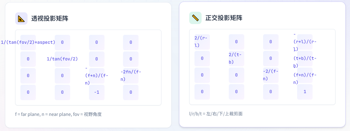 | NDC | [-1, 1]³ | 透视除法 (w 除法) | 硬件裁剪 |