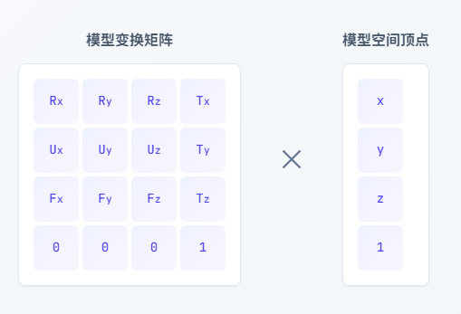 其中 Mmodel 是模型变换矩阵,由平移、旋转、缩放组合而成: