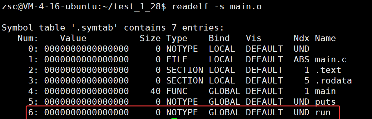 这里也可以看到main.o文件里面的run函数调用是UND状态,也就是未定义状态.