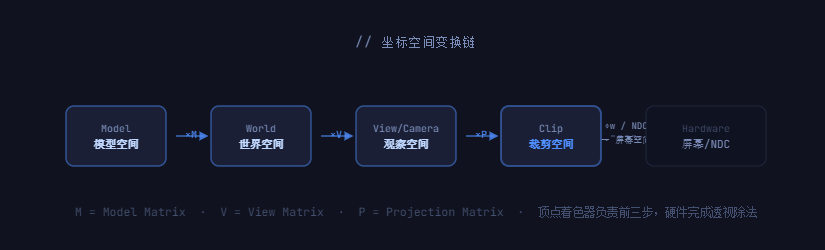 顶点着色器是渲染管线中第一个可编程阶段 。 GPU 对模型的每一个顶点并行执行一次顶点着色器,其核心职责是执行坐标空间变换 ------ 将顶点从模型空间(Model Space)转换到裁剪空间(Clip Space),即所谓的 MVP 变换。