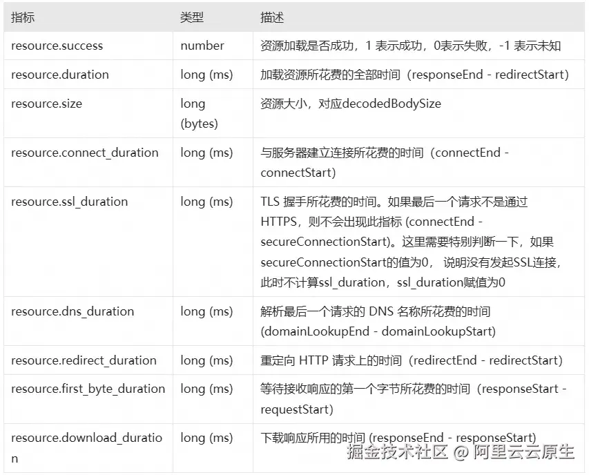 除了属性字段,Resource 事件还包含了核心的性能指标,这部分数据是我们排查网络请求慢的核心数据。