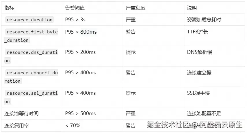 然而,这个案例也给我们带来了更深层的思考------性能优化不应该是"亡羊补牢"式的事后补救。除了掌握事后排查和优化的方法,更重要的是建立一套完善的性能监控体系,通过 RUM 控制台实时掌握应用的网络性能指标,将"被动救火"转变为"主动观测"。如果有需要,还可以基于 RUM 平台自定义配置告警规则(如连接池等待时间P95 > 500ms 时触发通知),进一步提升问题响应速度。