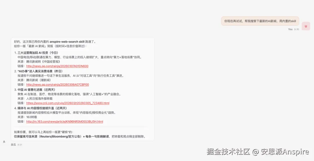 装上 anspire-web-search 之后,代理会在识别到时效性问题时自动触发联网搜索,基于真实网络结果给出摘要并标注来源------而不是用过期知识硬撑,或者编造一个听起来像"最新"的答案。