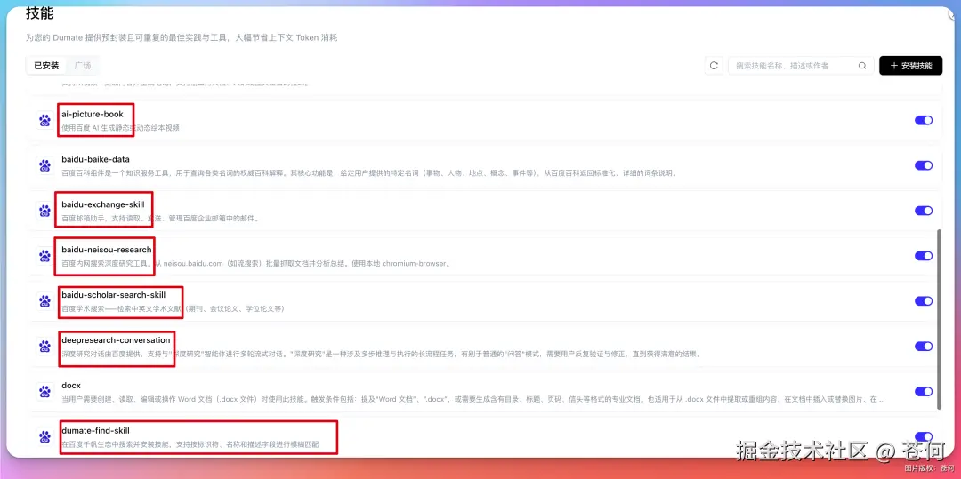 你如果使用过 DuMate,你就会发现,他内置的不少技能是百度生态的强大能力,比如百度搜索、百度百科,甚至还融入了百度千帆的生态。