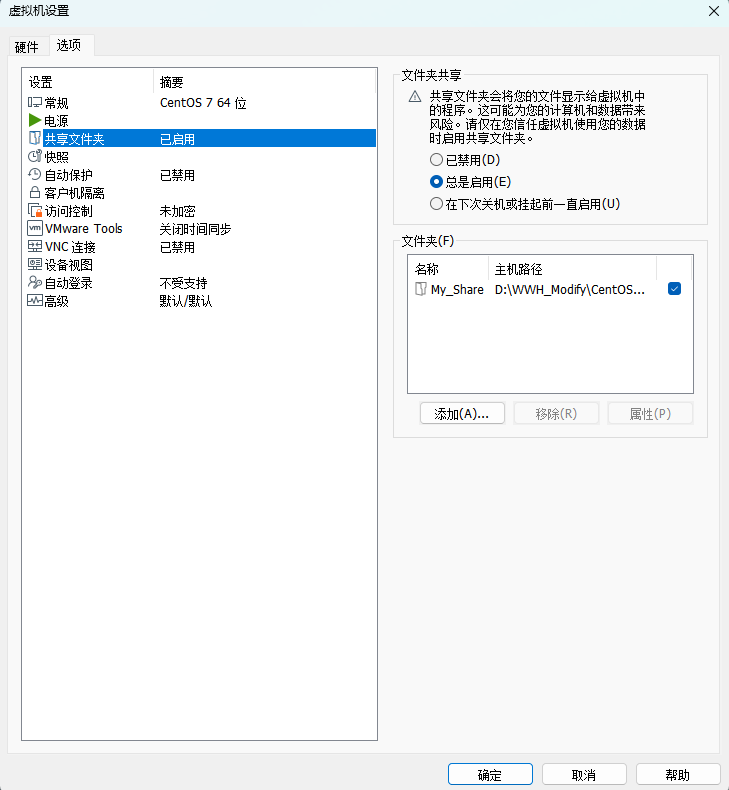 右键虚拟机->设置->选项->共享文件夹->选择"总是启用"->确定