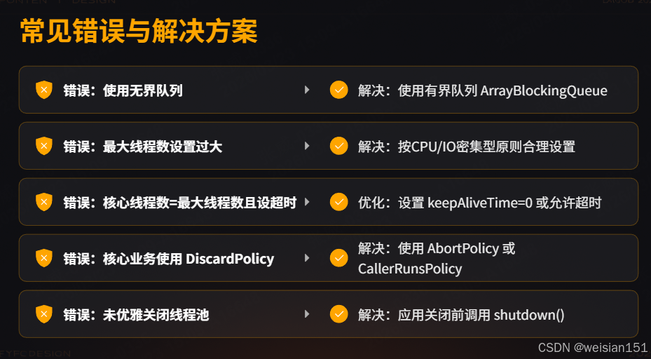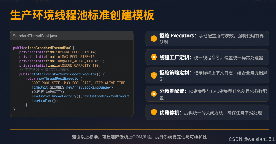 AbortPolicy或CallerRunsPolicy; - 线程池必须提供优雅关闭方法,避免JVM退出时资源泄漏;