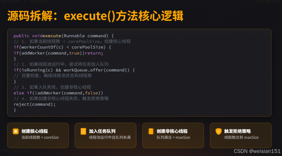 corePoolSize、maximumPoolSize、keepAliveTime、unit、workQueue、threadFactory、handler; - 执行流程:任务提交后,先判断核心线程→再入队→最后创建非核心线程→触发拒绝策略;